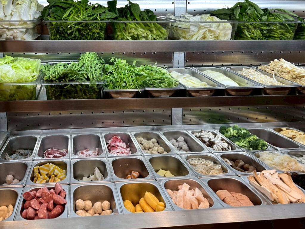 色とりどりの新鮮な具材がずらり!野菜は白菜・小松菜・レタス・青梗菜・水菜などの葉物から、きのこ類、豆腐、春雨まで種類豊富。さらに、えび団子・肉団子・ソーセージ・鶏肉・牛肉などの肉類や魚介、練り物のラインナップも。