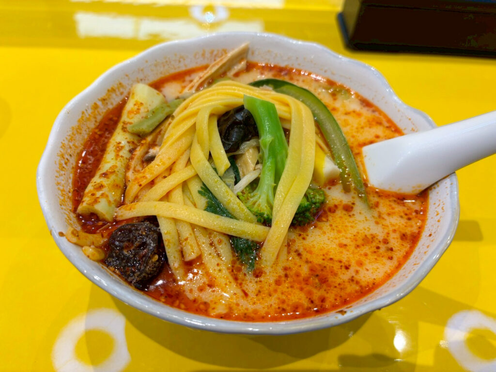 人気No.1『辛口麻辣湯(辛さレベル2)』を選びました。見た目は鮮やかな赤いスープ。表面にはラー油がきらきら輝き、具材の彩りも豊かで、見た目から食欲をそそります。