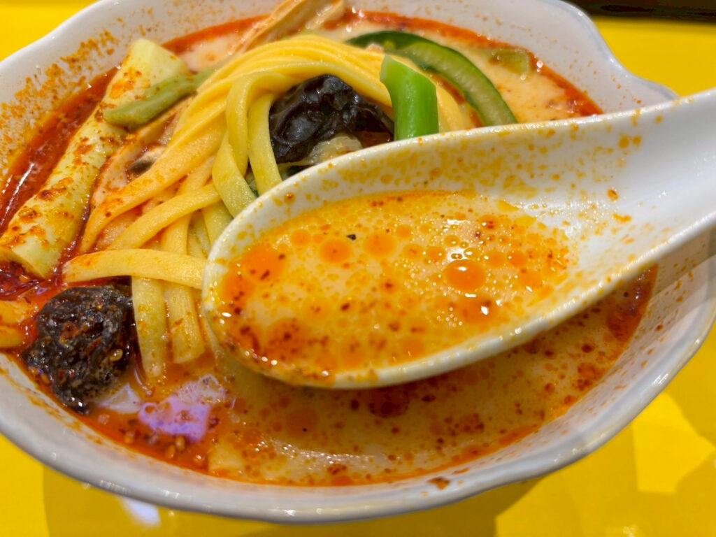 レンゲですくうと、スープはとろりとしていて、濃厚。ひと口飲めば、花椒のしびれるような刺激と、唐辛子のピリッとした辛さがじわっ~と広がる…。レベル2でもしっかり辛く、涙が出るほどで、ひと口目から熱さと辛さのダブルパンチ!ピリッとした刺激の中にコクがあり、後味はまろやかです。