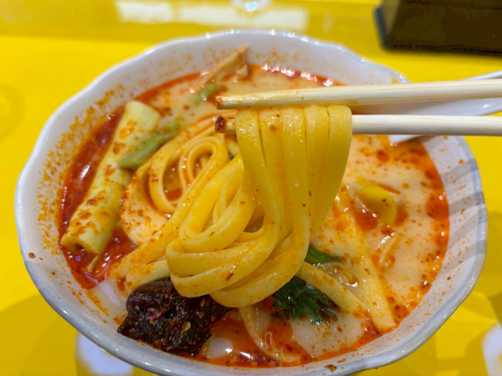 麺はコシのあるもちもち食感で喉を通るツルツル感も。スープがよく絡み、噛むたびに辛さと旨みがじんわりと広がります。