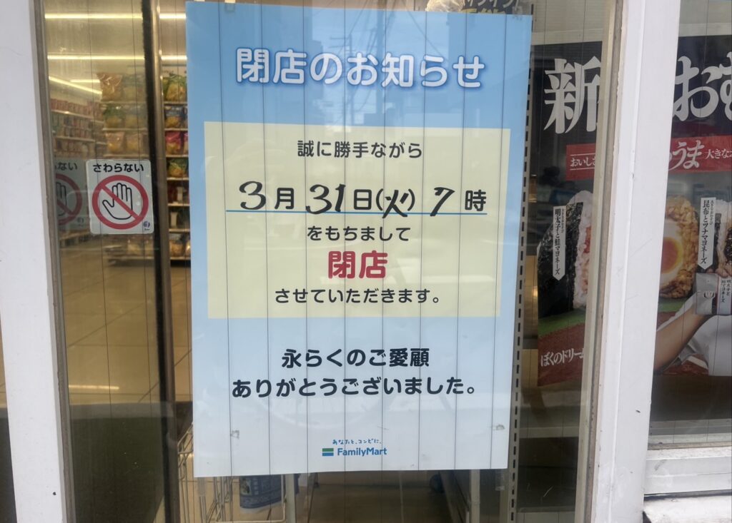 閉店武蔵境駅南口にある「ファミリーマート武蔵境駅南店」が、2026年3月31日(火)7時をもって閉店予定です。