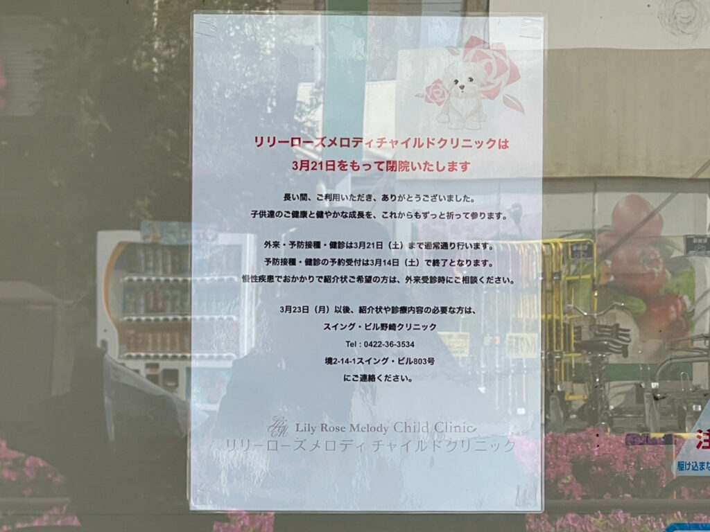 武蔵境駅前の小児科「リリーローズメロディチャイルドクリニック」が閉院してた