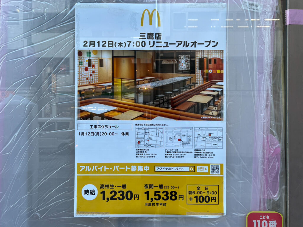 「マクドナルド三鷹店」がリニューアルオープンへ 現在改装に伴い休業中三鷹市XFacebookLINE2026.01.28三鷹駅南口徒歩3分にある「マクドナルド三鷹店」がリニューアルオープン予定です。リニューアルオープン日は2026年2月12日(木)を予定、現在改装に休業中です。SHOP INFOマクドナルド三鷹店Googleマップ三鷹市下連雀3-35-7クレッセント三鷹B1F 営/7:00~23:00 休/なしTEL:0422-40-0521HP コメント