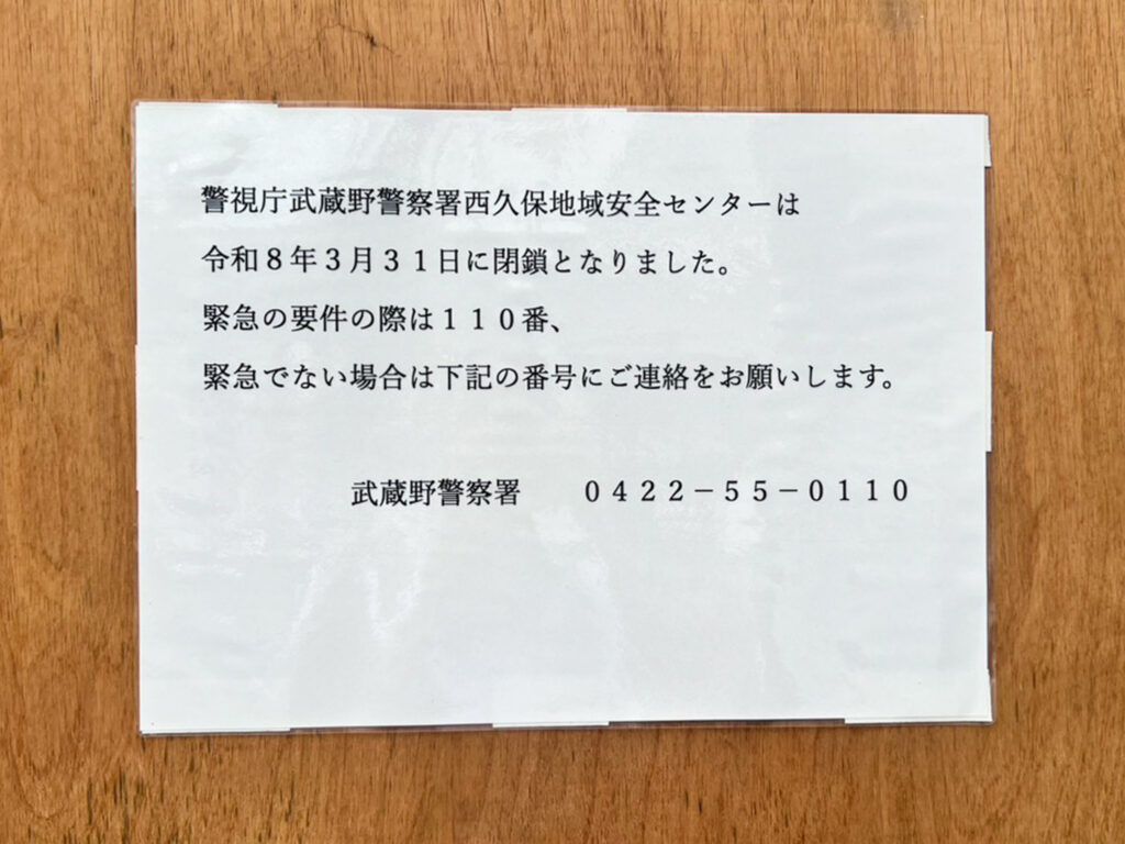 話題五日市街道沿い、バーミヤン武蔵野緑町店向かいにあった「警視庁武蔵野警察署西久保地域安全センター」が2026年3月31日をもって閉鎖していました。