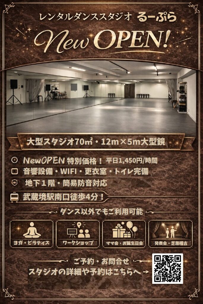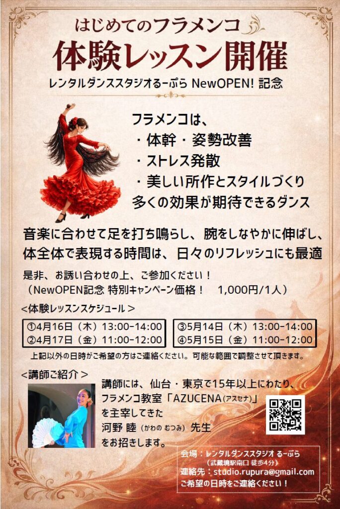 【NEW OPEN!】大型レンタルダンススタジオ「るーぷら」|武蔵境駅徒歩4分・フラメンコ体験レッスン開催!!